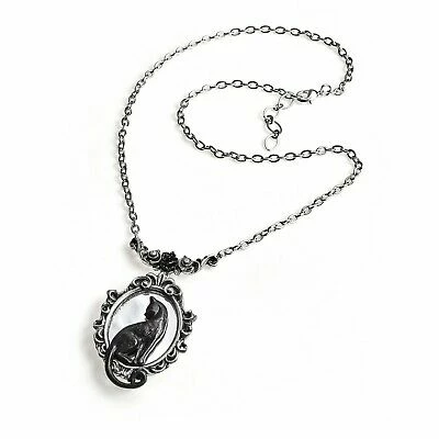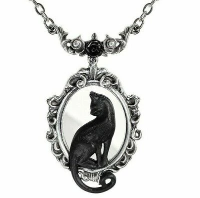 An ostentatious pewter pendant of a mirror in an ornate oval frame, with a black pewter cat sat looking onto the mirror. Made in England