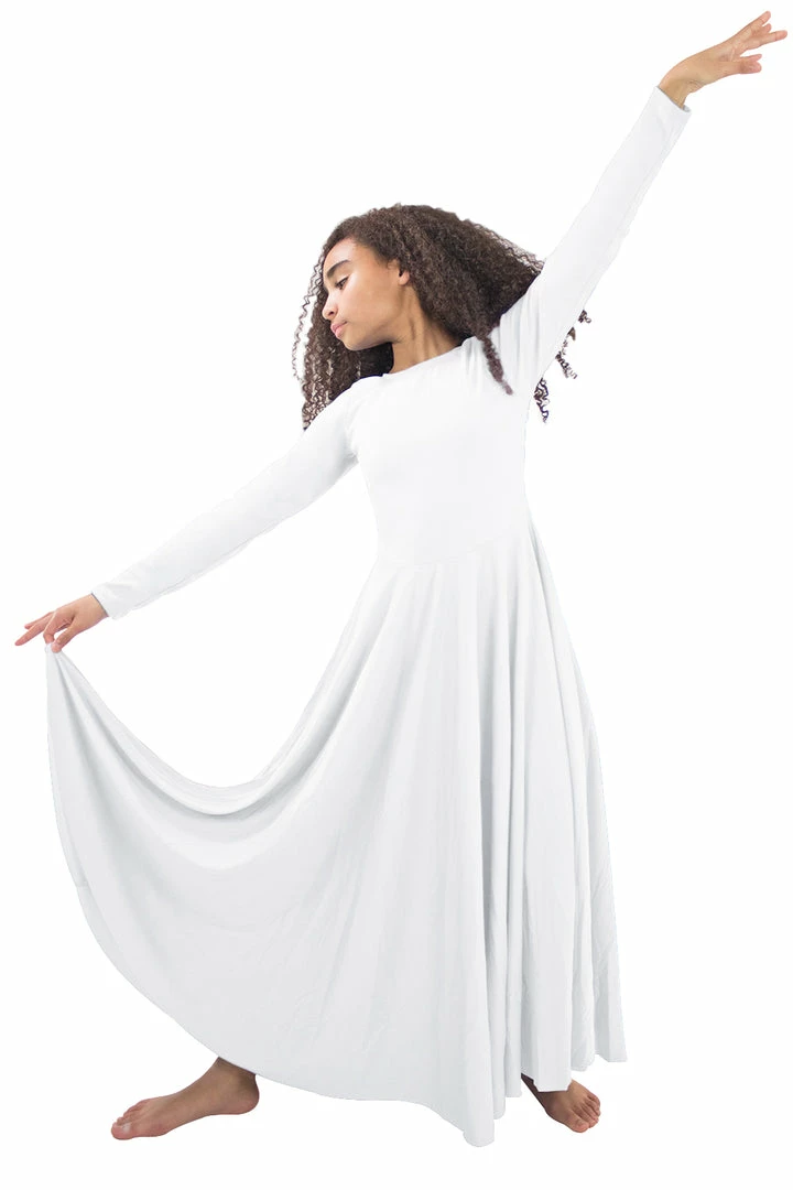 Fitted long sleeved full length dance dress is perfect to customize for so many types of dance performances or costume needs. The top part of the dance dress is lined and the bottom runs long and is not edged so it can be cut to any desired length. This dress also works as a great base to layer. Please be advised the dress does not have a leotard bottom but briefs can be purchased separately and the waist tie is not included with the dress. Additional colors are available by special order and group orders will get an additional discount.