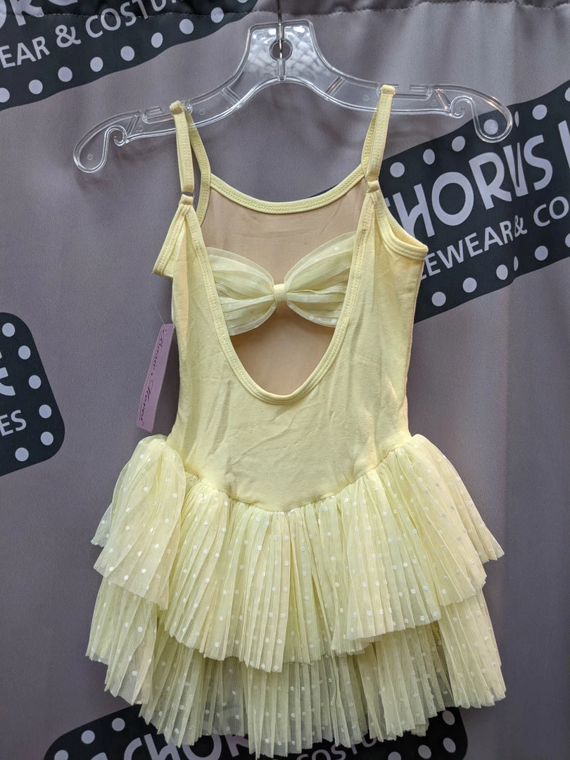 This lovely dance dress features adjustable camisole straps for easy flexibility and ensures a perfect fit! The double layer pleated skirt is designed with flocked swiss dots perfect for a springtime feel. The light yellow leotard is made of a soft and comfortable microfiber, adorned with a matching pleated bow in the back.