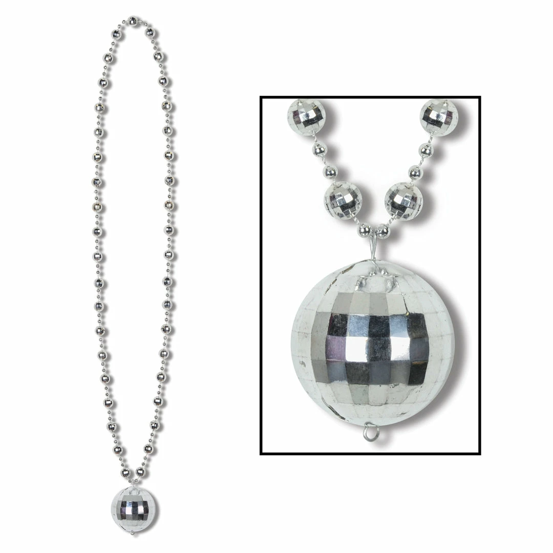 Who said Disco is Dead? No way! This groovy disco ball necklace will transport you back to the 70’s! The plastic silver disco ball pendant is attached to a silver bead necklace.