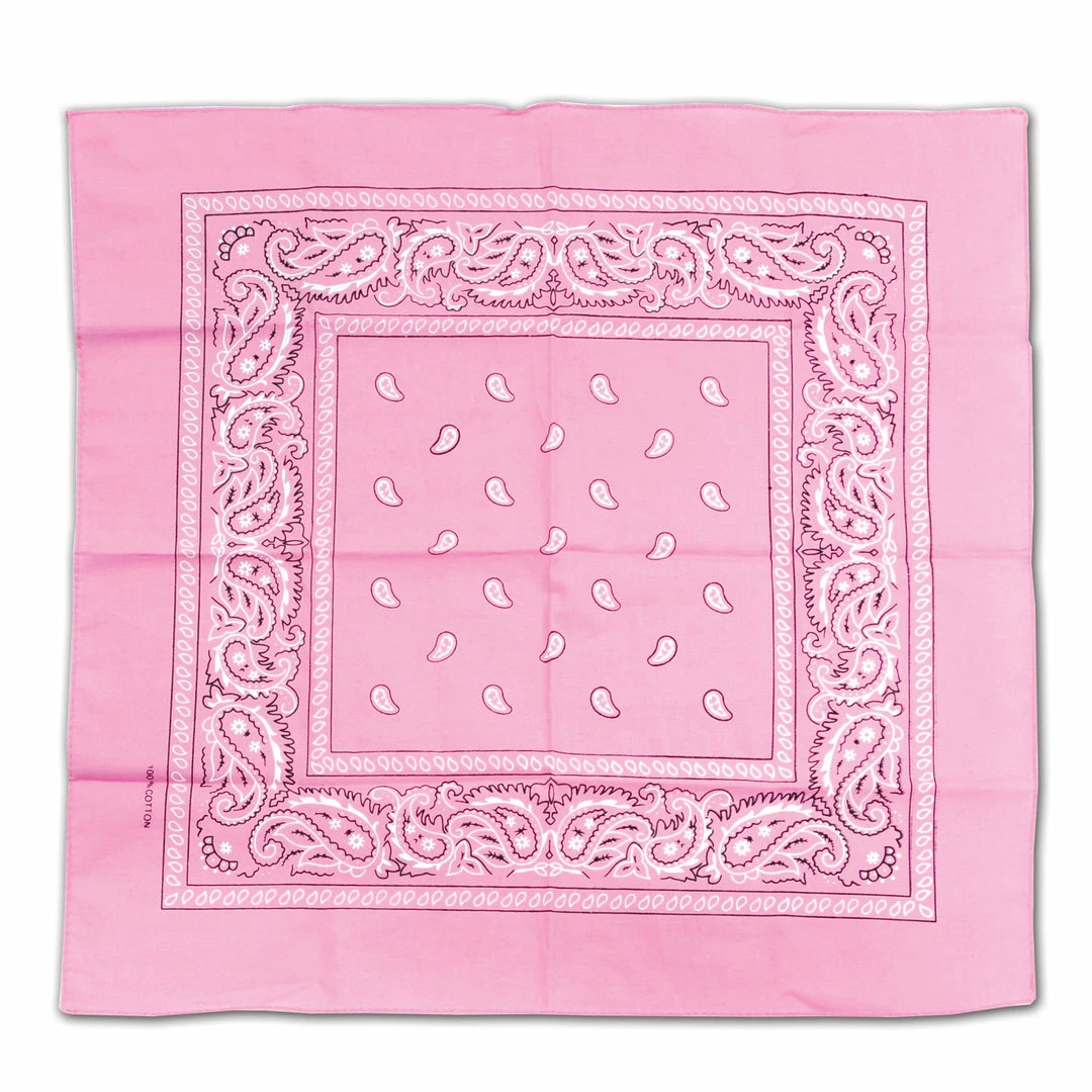 The bandana is a 22″ square with a classic paisley print. Says “100% Cotton Made in China” in black printed on the bandana.