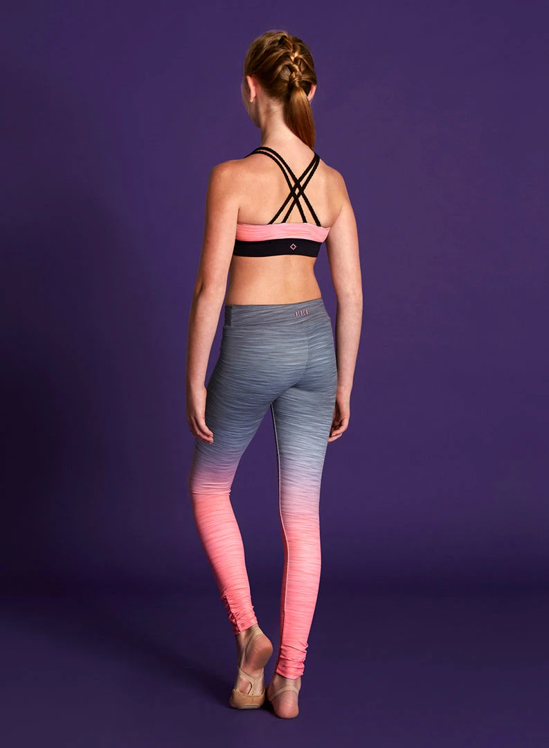 Adorable gradient color legging has a wide waist band with a touched ankle detail. The coral or violet with gray gradient matches well with black or gradient matching tops.