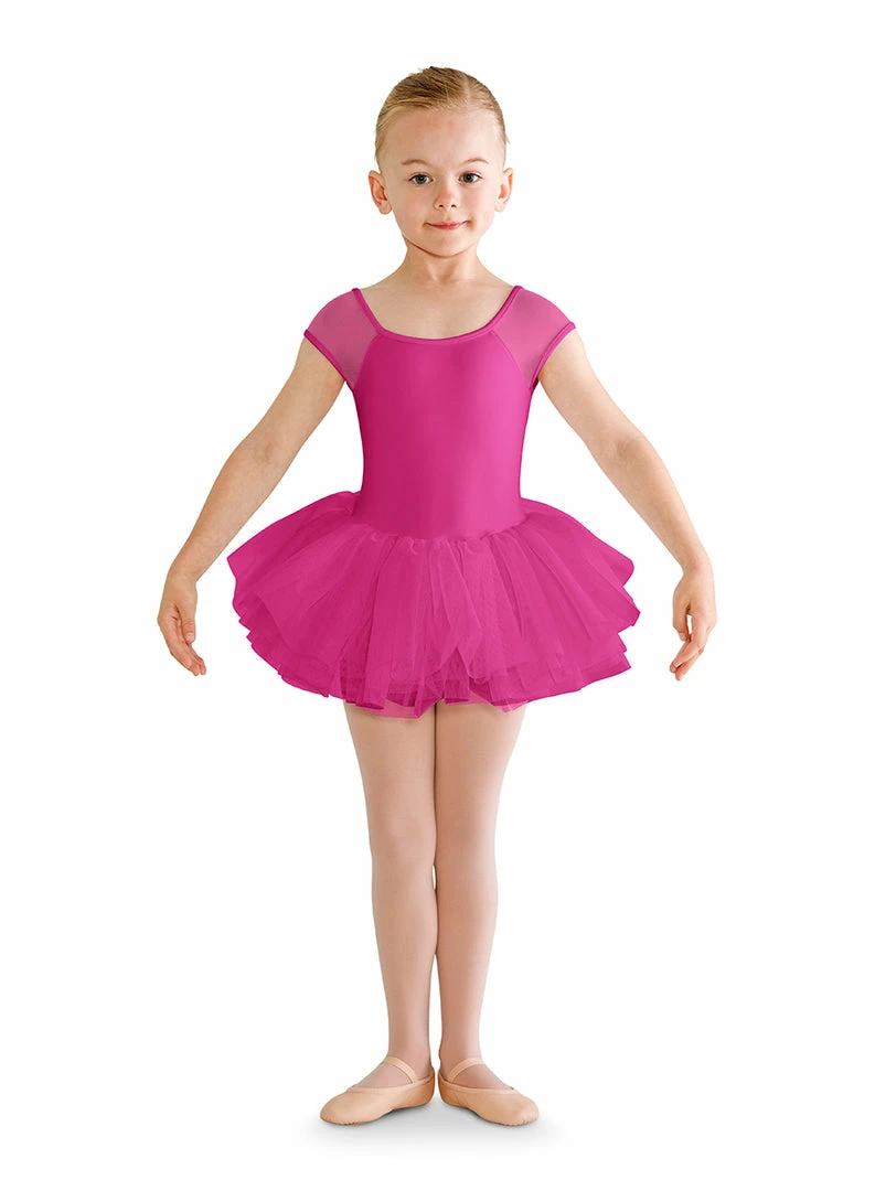 The cap sleeve tutu dress is an adorable style every little dancer will shine in! Features an attached tutu skirt crafted from multiple layers of soft tulle in light pink. Mesh cap sleeves extend across the top of the bodice into a beautiful mesh panel. A scoop back with a fabric binding joins the mesh to finish this precious look.
