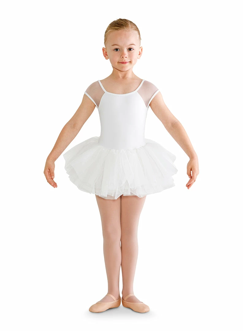The cap sleeve tutu dress is an adorable style every little dancer will shine in! Features an attached tutu skirt crafted from multiple layers of soft tulle in light pink. Mesh cap sleeves extend across the top of the bodice into a beautiful mesh panel. A scoop back with a fabric binding joins the mesh to finish this precious look.