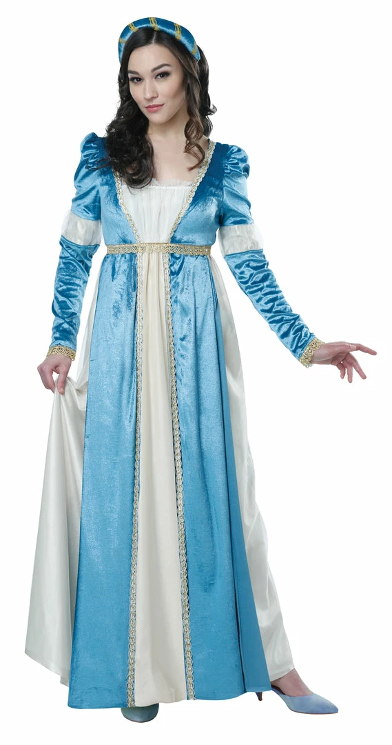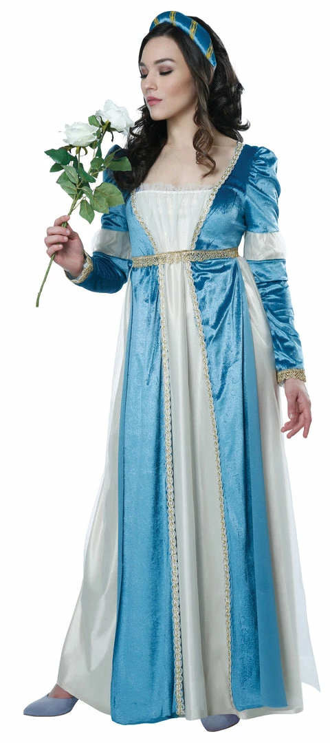 The lovely Juliet Renaissance style gown will make you fell like a maiden of times past. The beautiful muted smoky blue/green velvet gown has an empire waist with gold brocade trim and ivory chiffon and a nylon inset panel on the bodice. The bottom part of the dress has the ivory chiffon and nylon base with velvet panels overlaying the skirt.