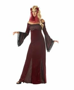 The beautiful Renaissance Maiden is a burgundy velvet dress witl black lace accents on the bodice, sleeves and skirt. Sleeves may be worn off the shoulder or on and the umpire waist and bell sleeves offer a feminine look.