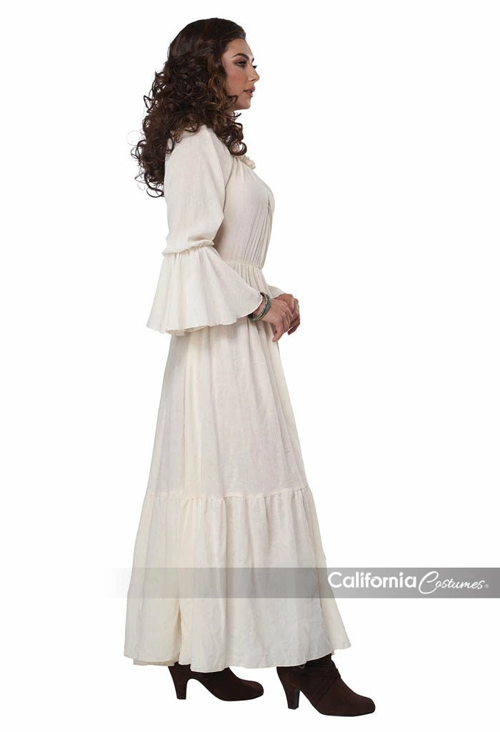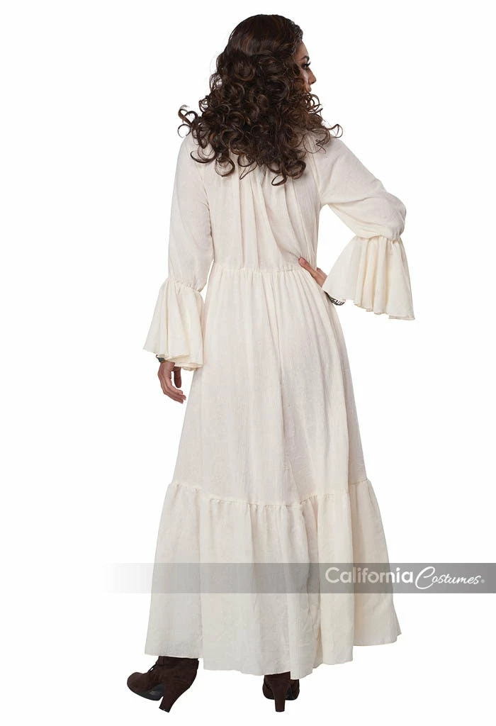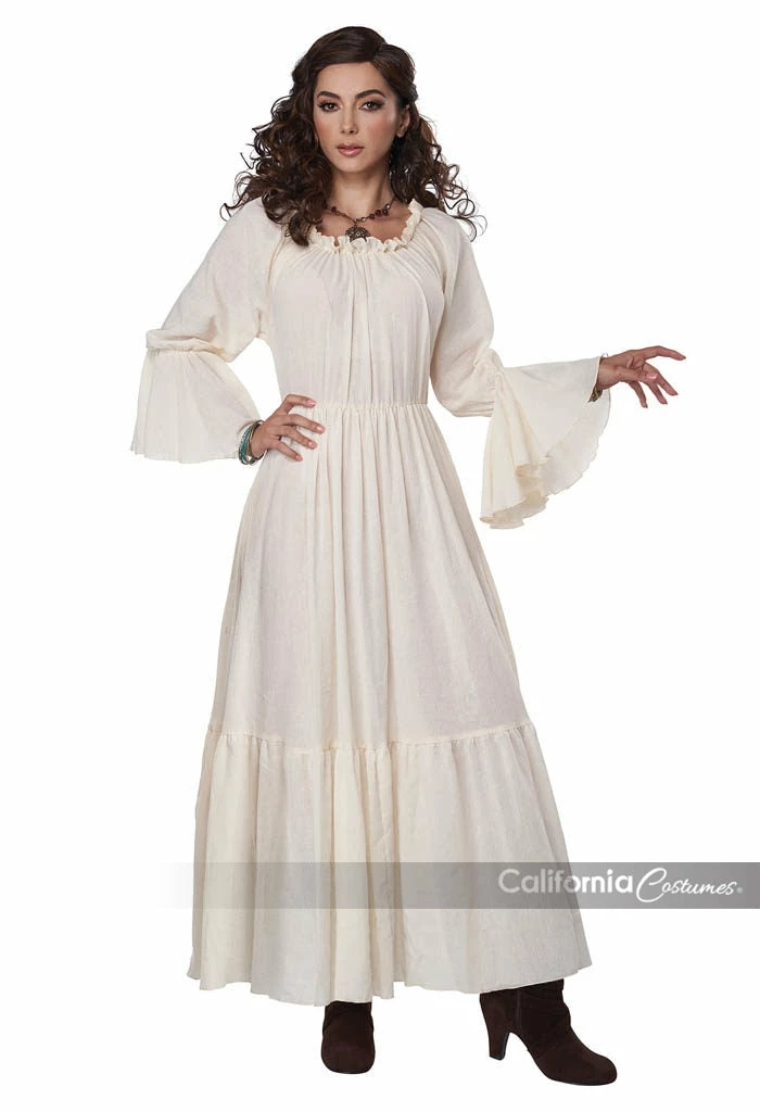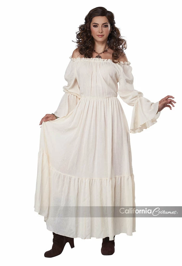 This Renaissance Peasant chemise is a cream colored dress with elastic collar and sleeve ends. With a neckline that can stay on your shoulders or rest just off the shoulders, this dress is a perfect base for a variety of looks! Jewelry, headband, boots, and other accessories to complete your Renn Faire or Pirate costume are sold separately.