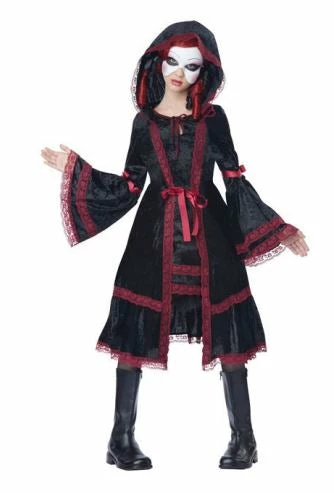 This creepy Vintage Doll Girl’s Costume could be the doll of your dreams or your nightmares. The stretch velvet dress features burgundy lace trim and wide bell sleeves.