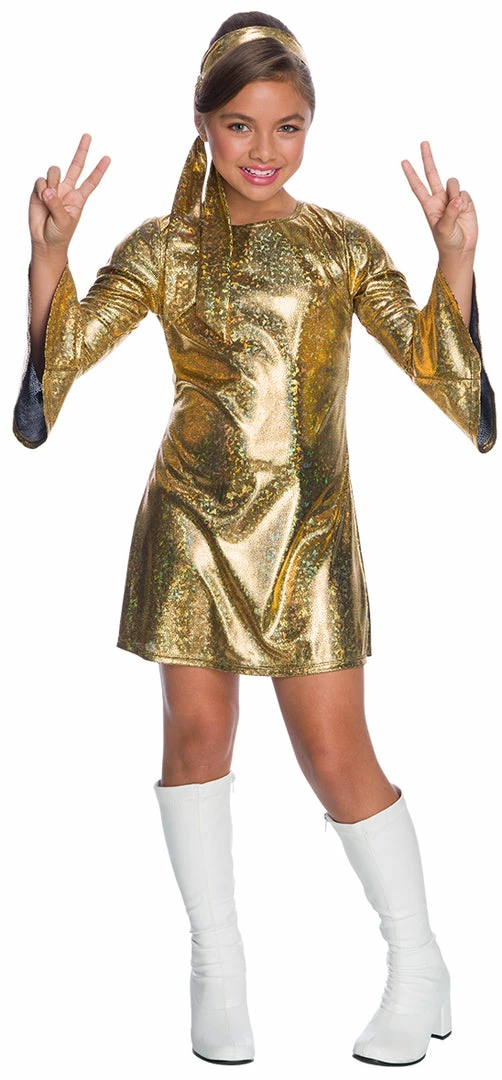 Hustle your way onto the dance floor with this Gold Hologram Disco Diva Child Costume. Deluxe print metallic fabric features a slight iridescence. Matching partner costumes available. GoGo Boots, belt, glasses and tights available separately.