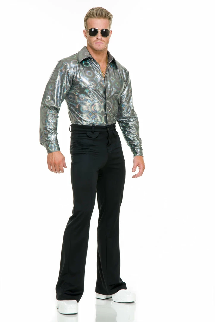 Hustle your way onto the dance floor with this Silver Hologram Disco Shirt. Deluxe quality metallic hologram circle print fabric allows this costume to become it’s own disco ball! Shirt features classic button down styling. Matching partner costumes available. Pants, wig, platforms, glasses, rings, and necklaces available separately! Includes: