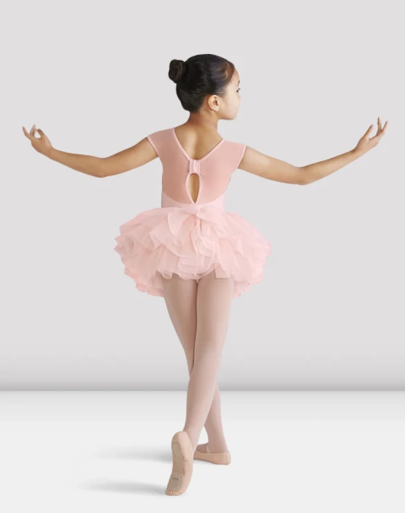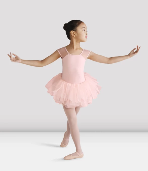 The cap sleeve tutu dress is an adorable style every little dancer will shine in! Features an attached tutu skirt crafted from multiple layers of soft tulle in light pink. Mesh cap sleeves extend across the top of the bodice into a beautiful mesh panel. A scoop back with a fabric binding joins the mesh to finish this precious look.