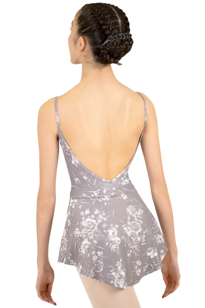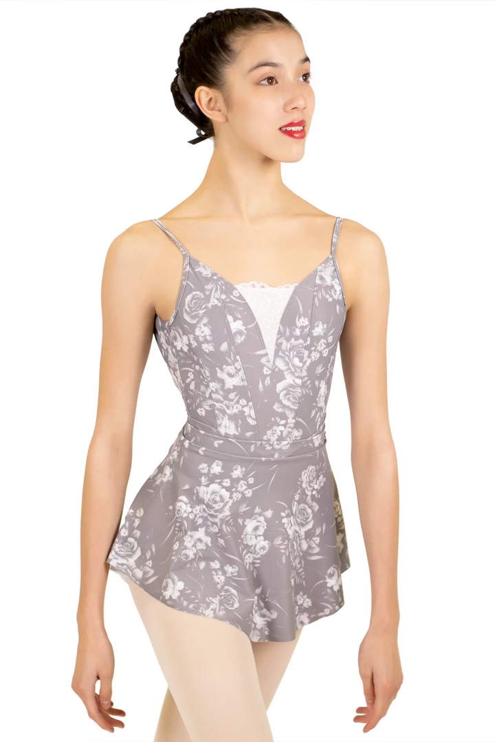Feel supported and graceful in the new Antoinette Dovegrey Leotard by Danse De Paris! This limited edition camisole garment is tastefully styled with corset seaming that comes to a V at the waist. The back has a low pinch V- back that looks gorgeous. The leotard is front lined with a small v-lace panel . The grey floral design is a beautiful and subtle print with a hint of drama. The high performance fabric is a microfiber and lycra blend so it won’t fade or shrink. You will love how you feel in this gorgeous new style!