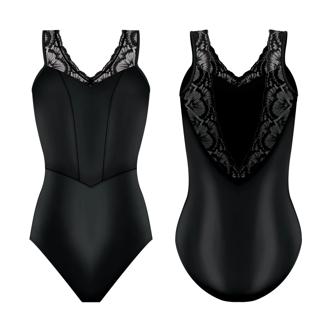 The Moulin leotard captures all of the excitement and elegance of Paris! This spectacular Limited -Edition leotard boasts exquisite black lace trim from the front sweetheart neckline all the way to its dramatic V-shaped back. In classic Danse de Paris fashion, the bodice of this leotard has that same corset- style stitching and waist seaming for a perfect fit. If you’re a dancer that’s looking for some thing a little bit different, this is your leotard!