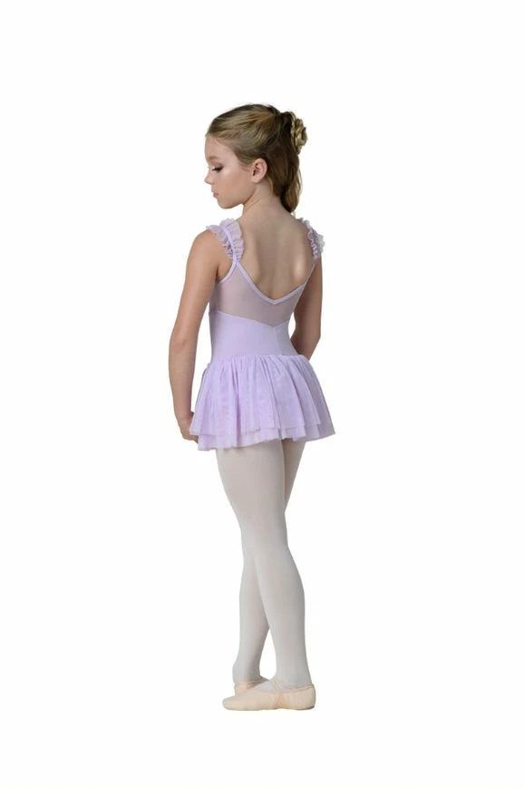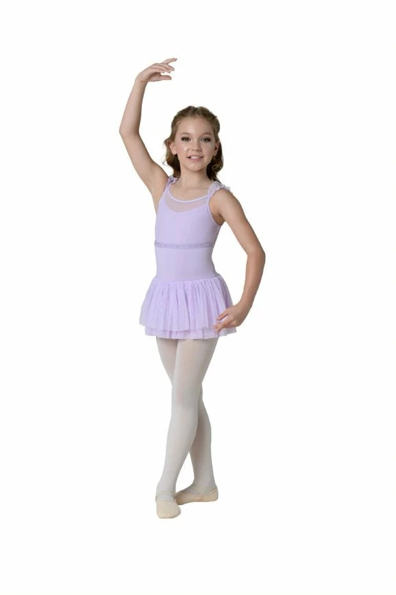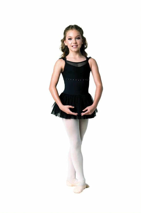 This camisole dress has a cute line of rhinestones under the bust and a mesh neck line. Also includes tulle straps, v-shaped back, and double-layered skirt. Fully front lined. Nylon & Spandex Blend.
