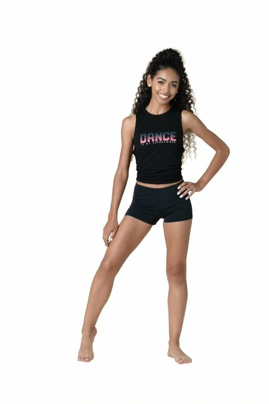 This tank top is versatile enough to be worn loose and long or tied and fitted. On the front, it says “Dance is my Superpower” and has a cute keyhole at the middle of your back in either style. Fabric is soft, lightweight, and comfortable! Made from a Polyester/Rayon blend. Also available in child sizes.