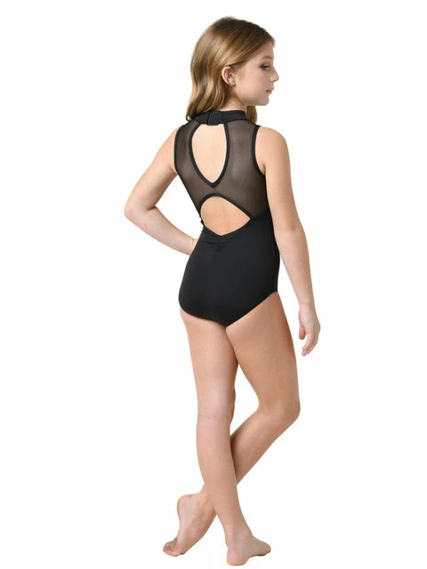The Quinn leotard has a solid black front with a mock turtleneck. Features a sheer mesh back with double keyhole detailing.
