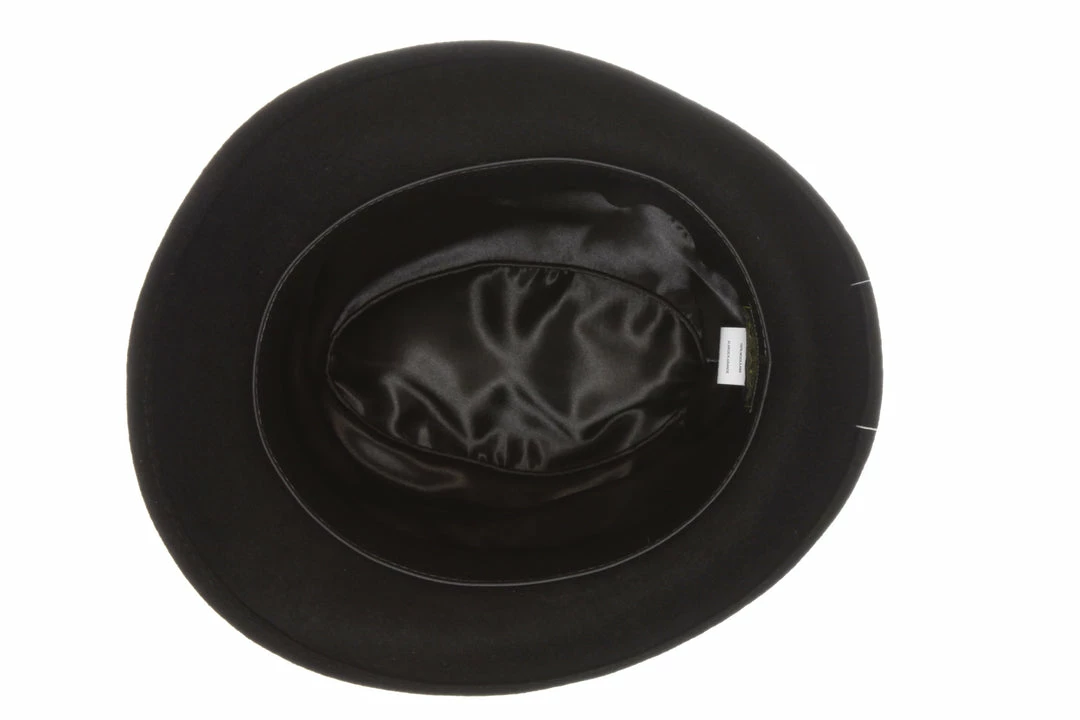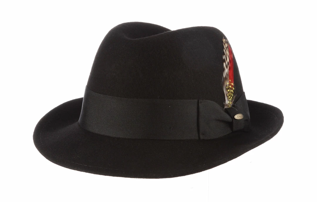 The Deluxe Quincy Fedora is a must have for any type of Gangster or 1920’s style gentleman. The black structured wool felt fedora is sure to take your look to the next level. Features a 2.25″ brim, a grosgrain band, feather accent, and a satin lining. Available in sizes M-XL.