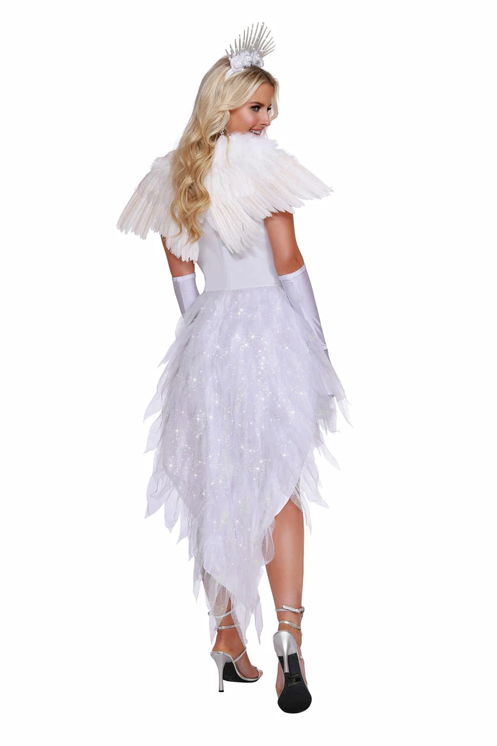 This glistening white angel costume includes a dress with sequined neckline applique, a hi-low hemline skirt with layers of glittered feather shaped petals, feather angel wings, and a headpiece. Gloves and jewelry sold separately.