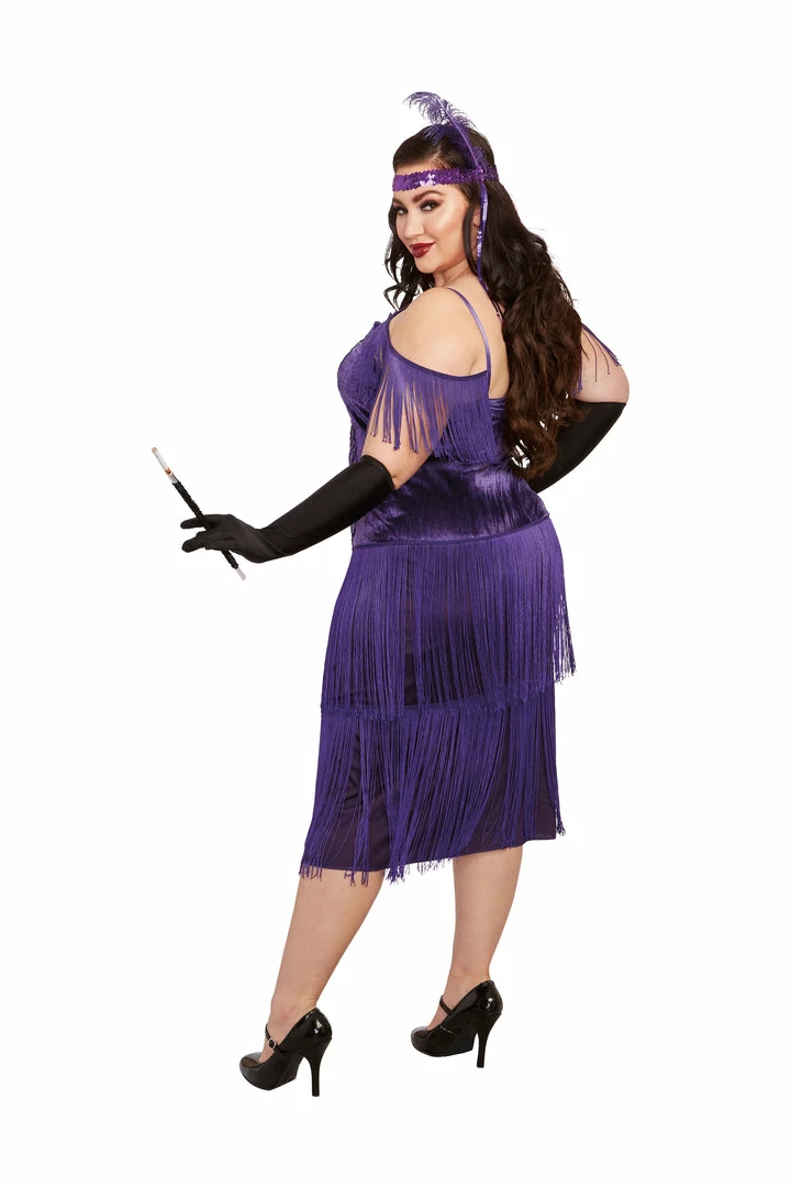 Miss Ritz is an exquisitely rich purple stretch velvet flapper dress with off the shoulder fringe sleeves and a back zipper. It includes a purple stretch sequin headpiece with an ostrich feather. Gloves, cigarette holder, and earrings are sold separately. Smaller sizes available.