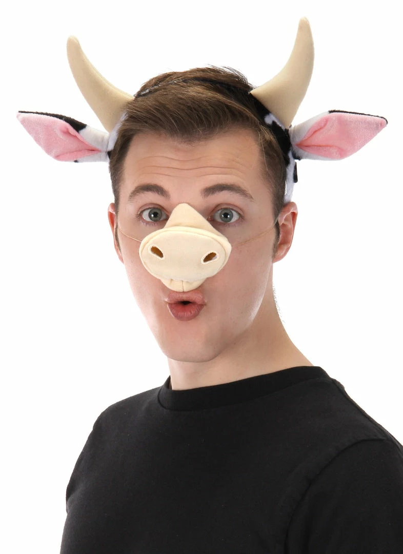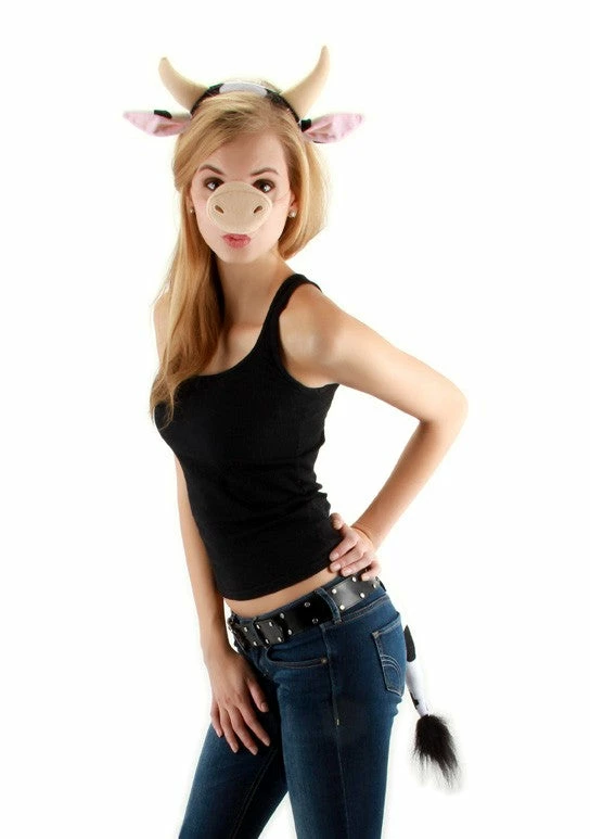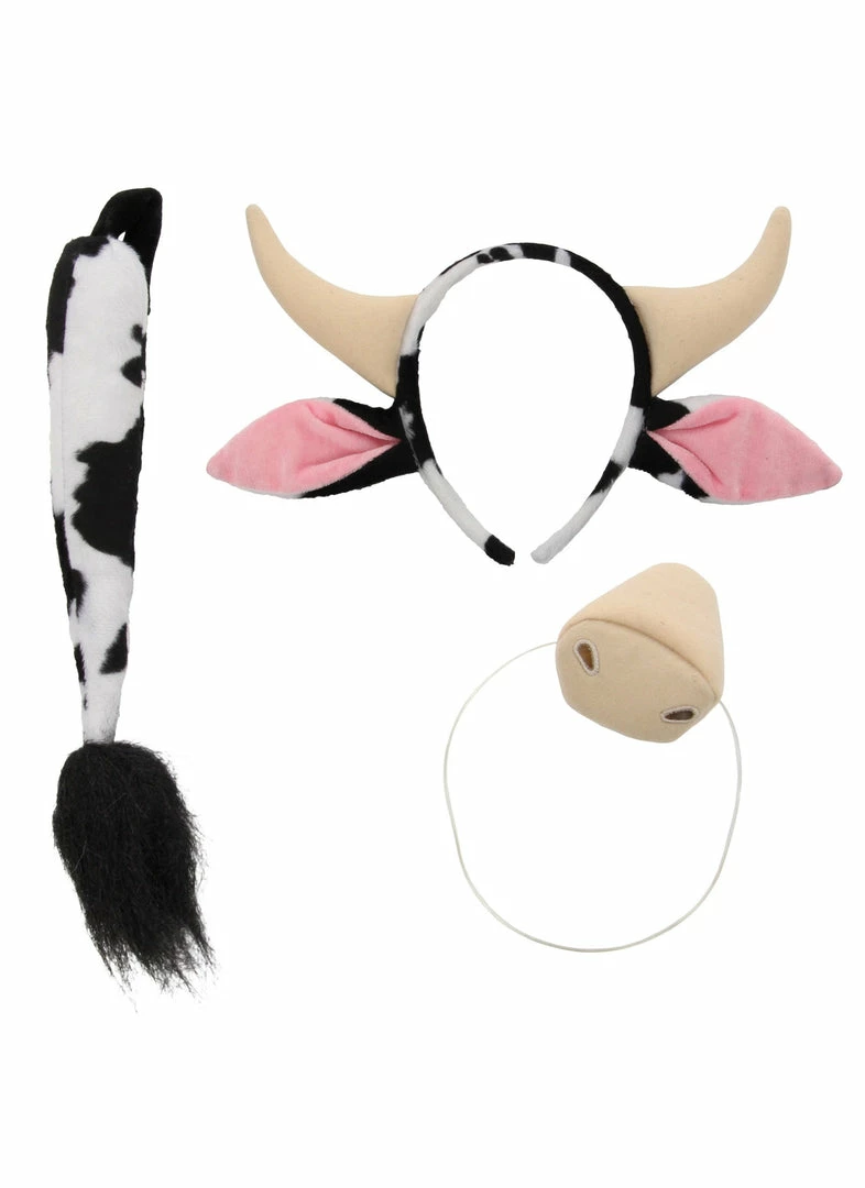 Be ready to barn dance in this Cow Costume Kit by elope. Black and white spotted cow ears with pink lining and adorable plush horns adorn the comfortable covered headband. The oversized plush nose covers your face with the aid of a comfy, clear stretch cord. A bushy faux fur tipped tail features more delightful dairy cow pattern with an easy-to-wear Velcro belt loop attachment. Pair this accessory set with your other outfit items to finish your farm animal costume. Designed to fit farmland friends and cute cow cosplayers of all sizes, this costume kit makes a great addition to your whimsical wardrobe or novelty dress-up collection. Moo-ve on down to the farm for some ol’ fashioned fun in this cute Cow Dress-up Set by elope.