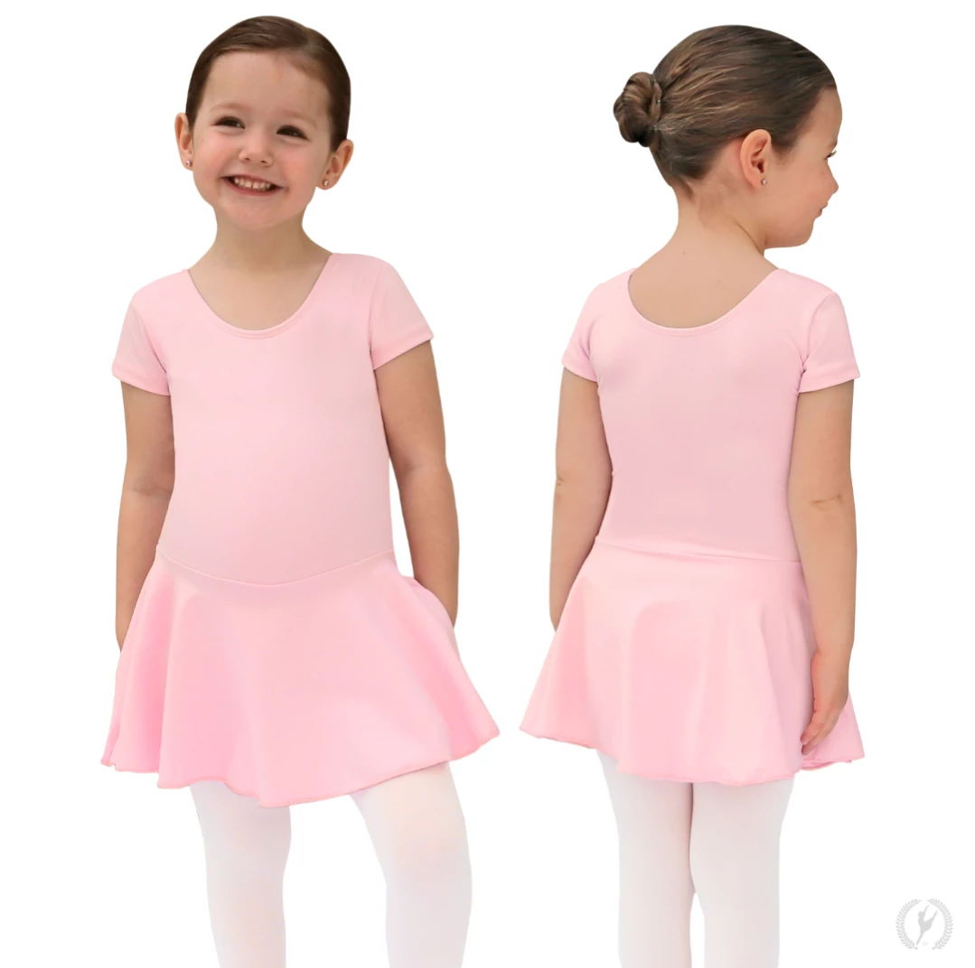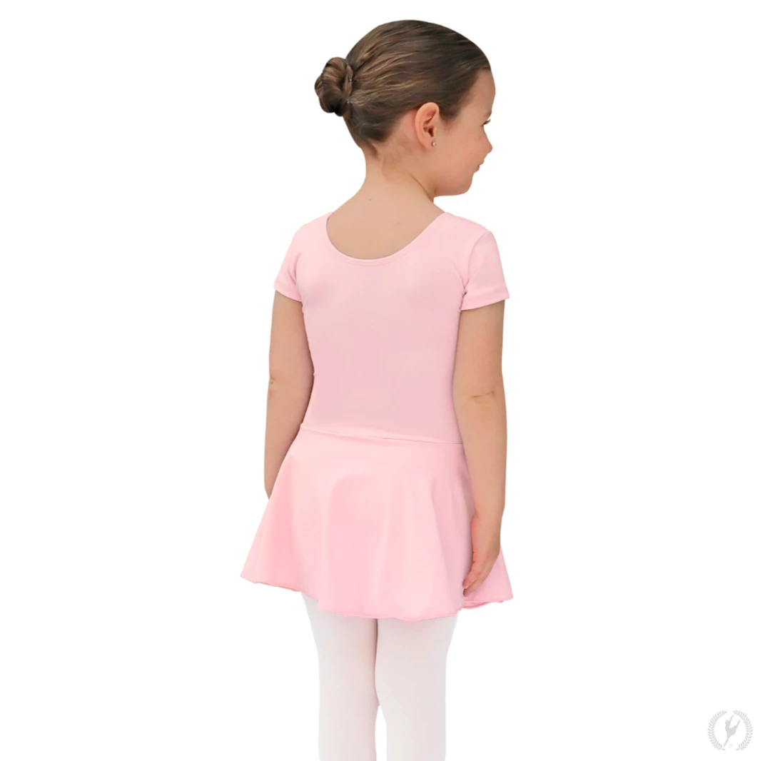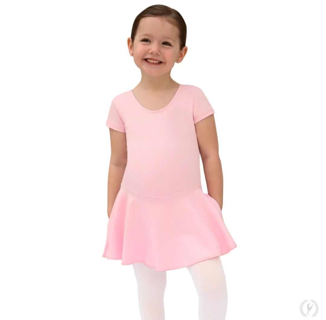 This short sleeve dance dress is made with incredibly soft and resilient microfiber, a material that is not only ultra comfortable but also holds color, shape, and softness wash after wash. Features include fitted short sleeves, a modest scoop neck and back, and an attached, matching microfiber skirt. The extended length of the attached skirt satisfies uniform requirements for American Ballet Theatre (ABT) curriculum. This leotard is fully front lined with Eurotard’s unique odor-neutralizing, quick-dry material for superior comfort and coverage.