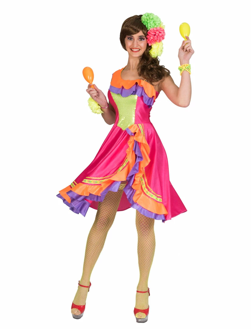 Caribbean Cindy features a one shoulder colorful ruffle dress. Headpiece and maracas sold separately.
