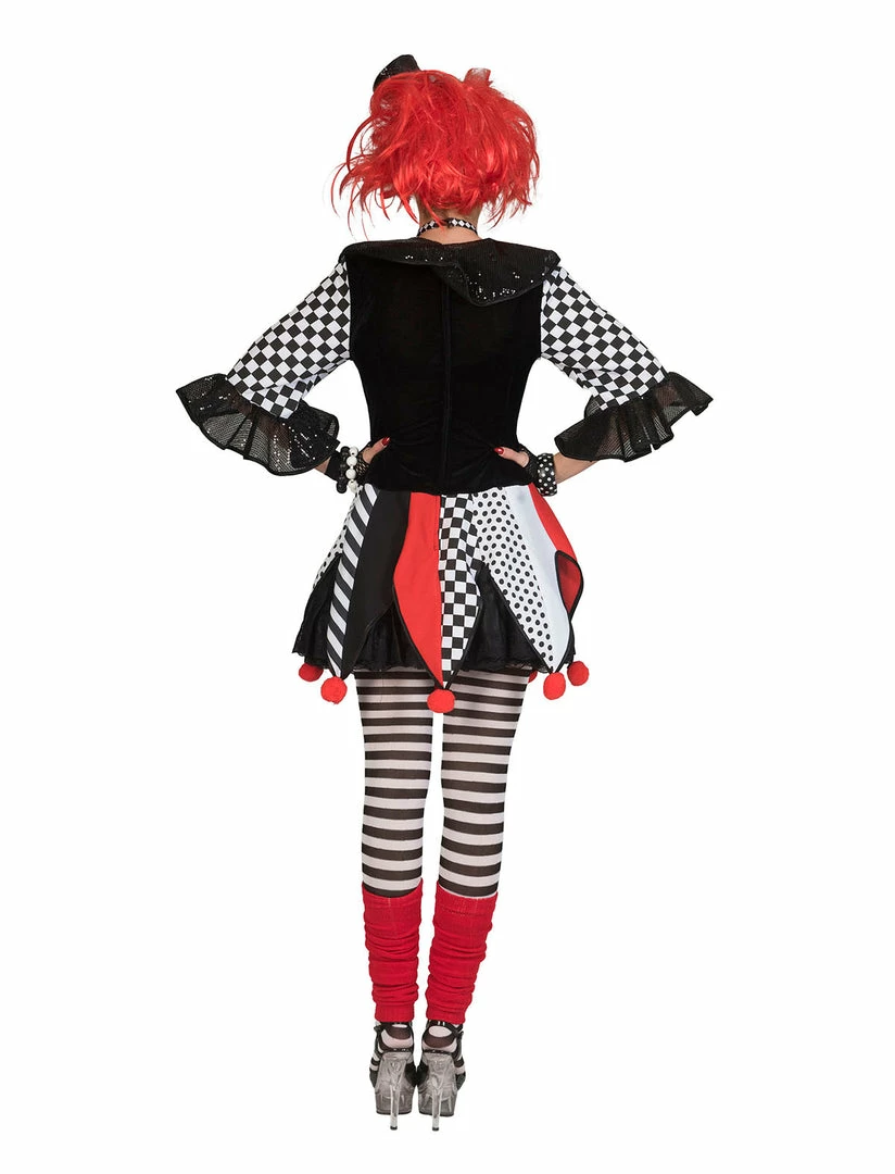 Adorable contrasting red, white, and black checkerboard and stripes pattern print dress decorated with red pom poms. Add striped tights, makeup, wig, hat, gloves, and legwarmers to create this unique look. All available at A Chorus Line. Check out the partner costume, it makes a great couples look!