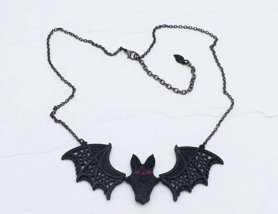 The elegant black metal choker has an antiqued scroll design within the bat design. The bat has two beaming red stones in its eyes. Adjustable back lobster clasp fits all neck sizes. Lays beautifully and looks even better in person. Perfect for Victorian, Gothic, Vampires, Witches and anything Halloween. Look for coordinating earrings. Made in the USA.
