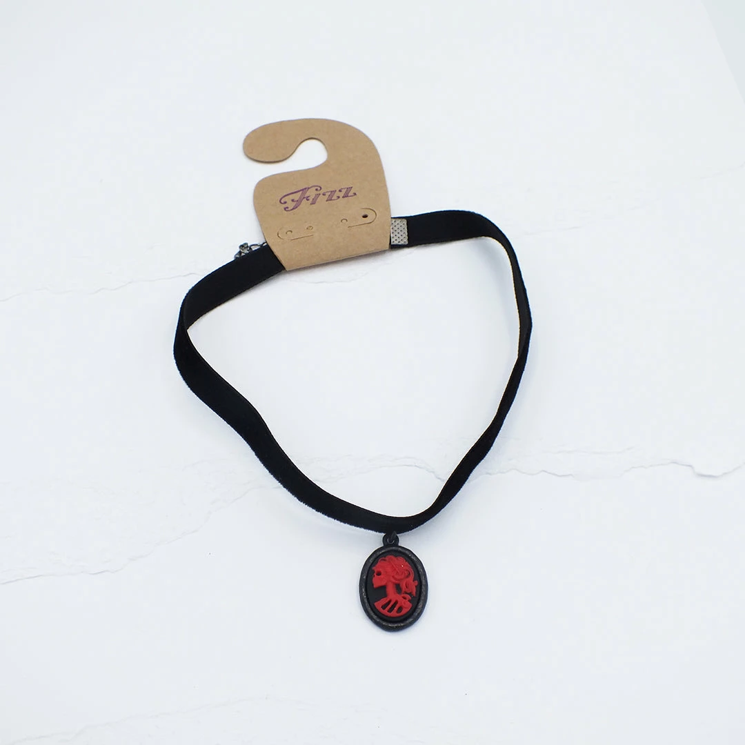 The elegant black velvet ribbon choker has an antiqued raised female red skeleton cameo with a black background and black frame. Adjustable back lobster clasp. The velvet ribbon is 3/8″ wide by 12″ long and the cameo is 7/8″ long and 5/8″ wide. Perfect for Dia De Los Muertos, Gothic, Vampires, Witches and anything Halloween.