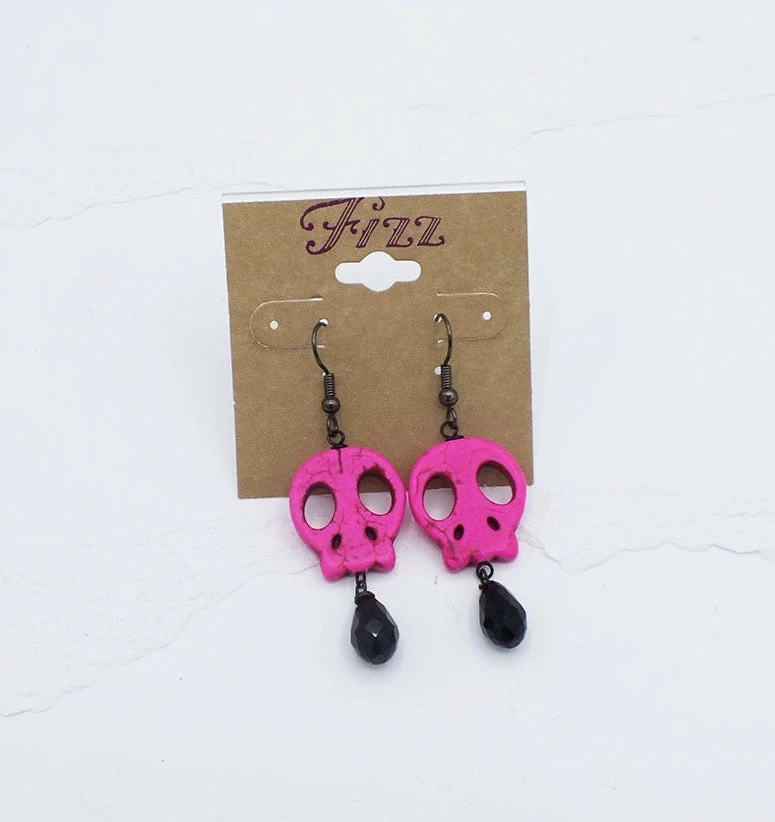 The bright hot pink skull charm earrings hang from a fishhook style earring and have an oval shaped bead dangling from the skull. Perfect for Dia De Los Muertos and anything Halloween. Look for coordinating charm necklace. Made in the USA.