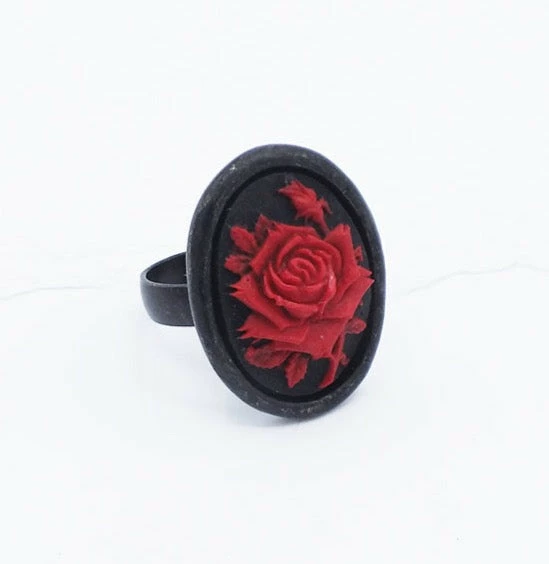 The elegant cameo ring has an antiqued raised red rose cameo with a black background and black frame.  Adjustable ring fits most finger sizes.  The cameo medallion measures 7/8″ wide and 1 1/8″ long.  Perfect for Dia De Los Muertos, Gothic, Vampires, Witches and anything Halloween.  Look for coordinating earrings and chokers.  Made in the USA.