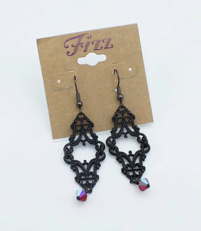The elegant black metal choker has an antiqued scroll design with an iridescent red crystal dangling from the bottom of the earring. The earrings have a fishhook attachment. Perfect for Victorian, Gothic, Vampires, Witches and anything Halloween. Look for coordinating necklaces. Made in the USA.