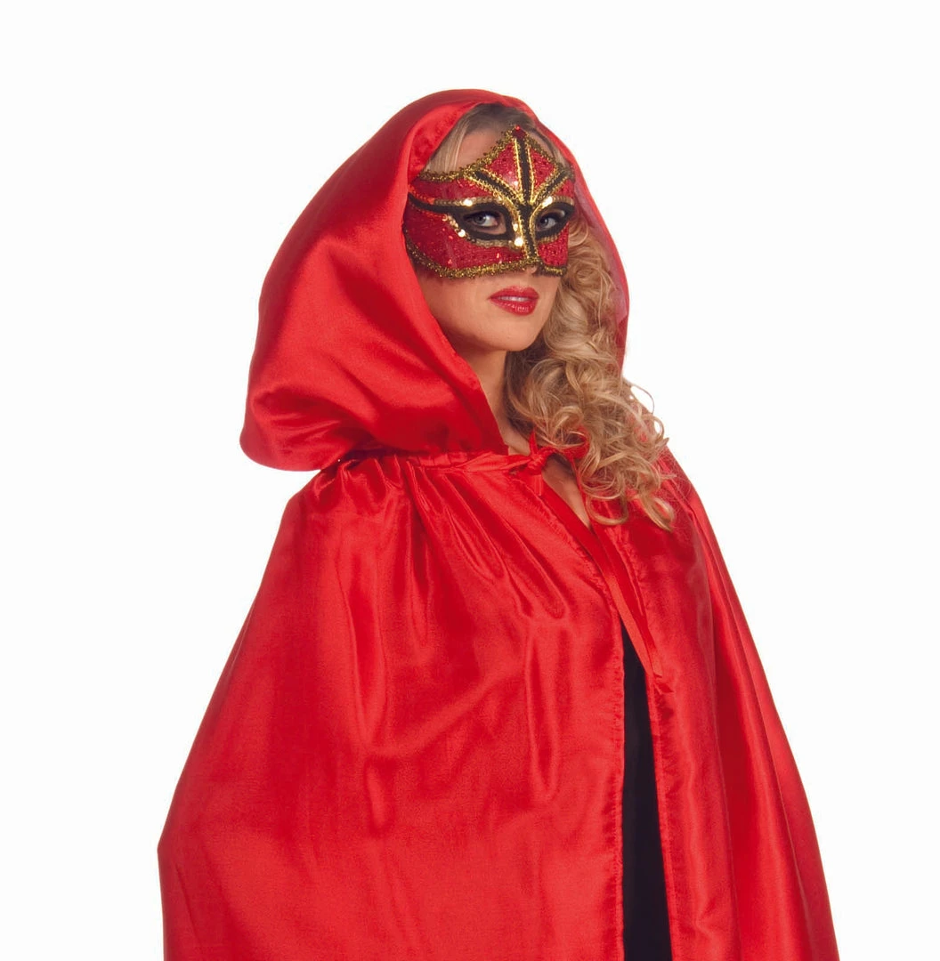 The floor length Masquerade Cape in Red has a big billowy hood and a satin ribbon neck closure. The cape is a classic red and is a satin taffeta fabric.  It is the perfect look for a Little Red Riding Hood or Masquerade. Includes cape only.