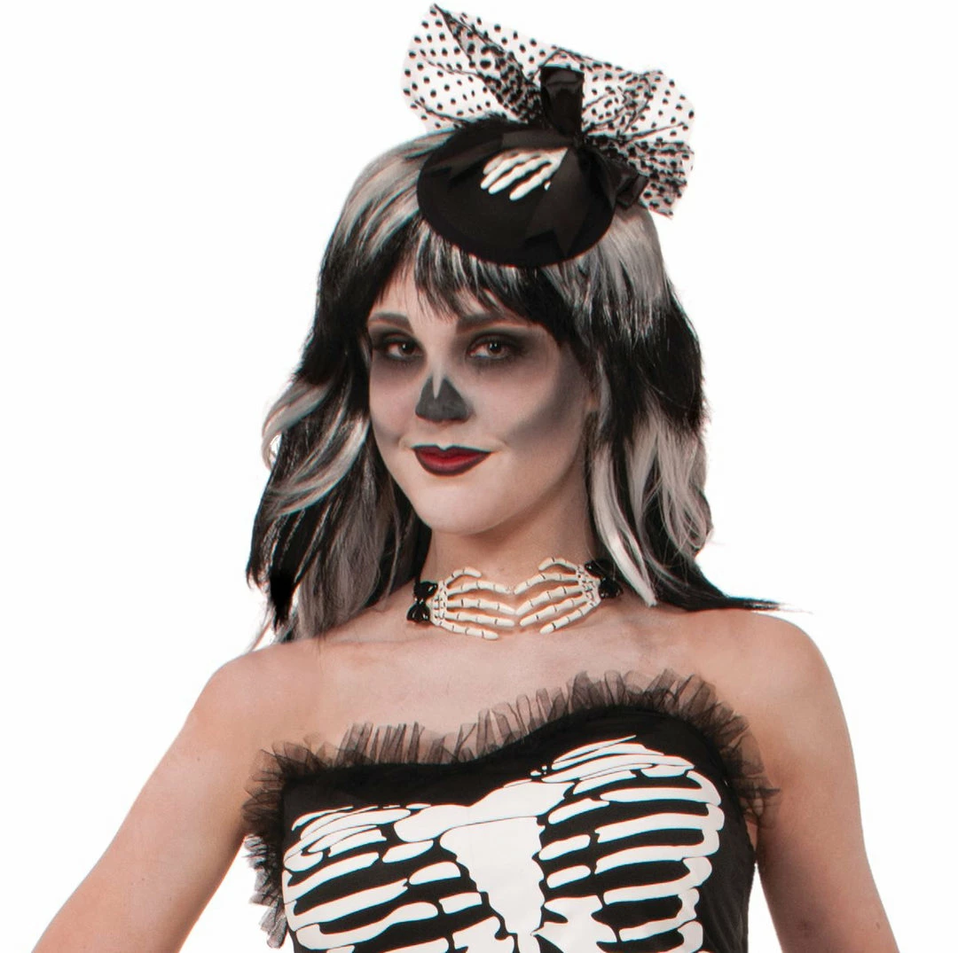 Don’t get choked up by these skeleton hands. This choker makes a cute thematic addition to your Day of the Dead outfit or Halloween costume!
