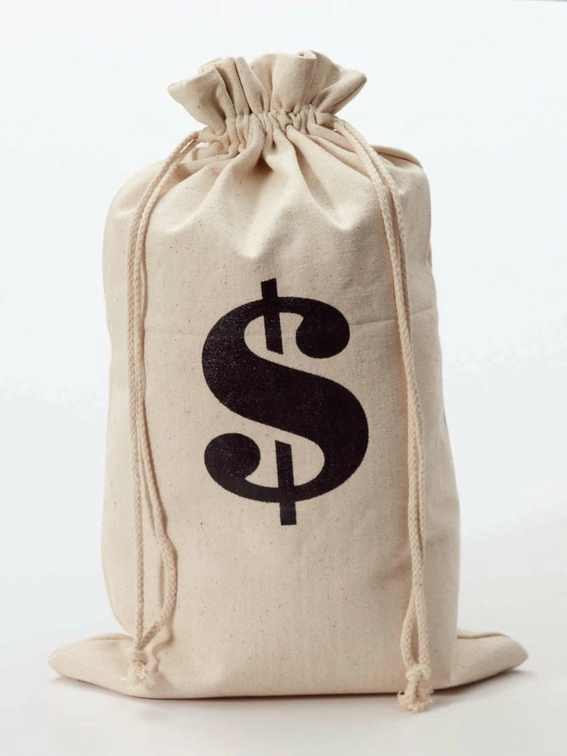 White canvas bag for all your holdups! The screen printed dollar sign bag on a heavyweight canvas is the perfect and practical accessory for old west bank robbers, cat burglars, and theatrical props.
