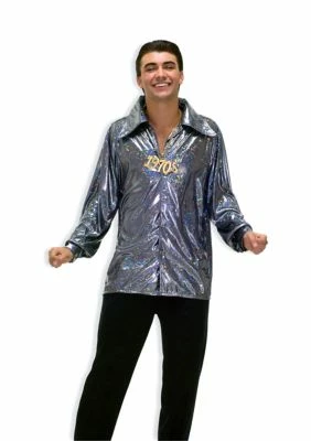 Welcome back to the funky 1970’s when groovy swirls of color and bell bottoms ruled. This shiny funkadelic long sleeve button up shirt with a wide collar is a great look for your disco party. Includes shirt only. Other accessories and bell bottoms available separately.
