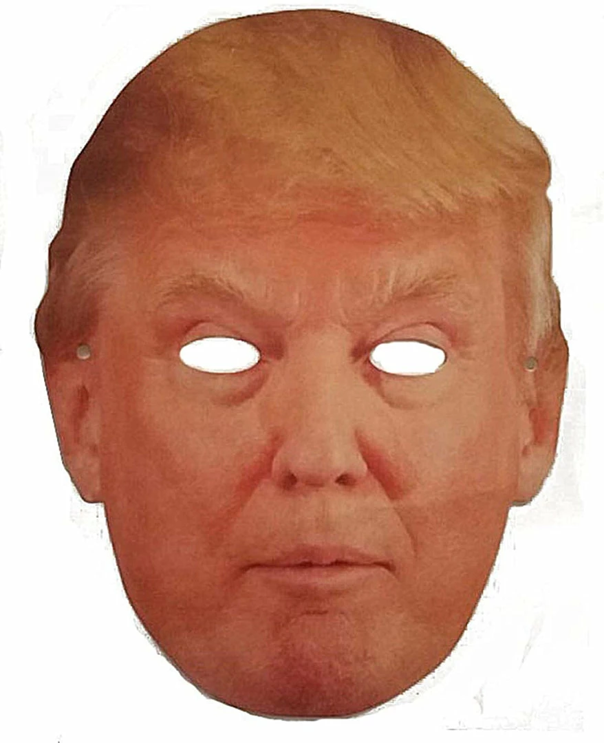 The paper Trump mask has a full front with an open back and an elastic band secures the mask around the head. The mask has small eye and ear holes made but if needed, you can increase the size.