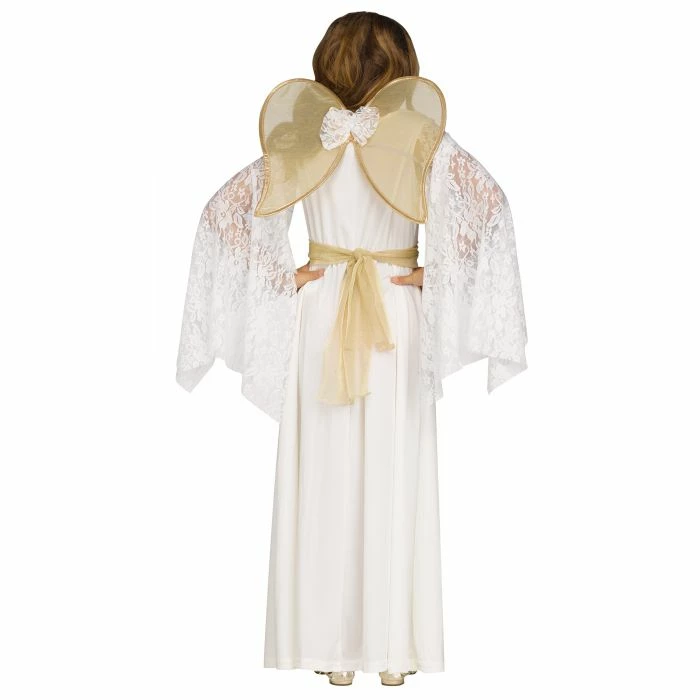 This Angelic Miss Costume is a lovely ivory nylon gown with attached lace sleeves. Perfect for plays, dress up or trick or treating!