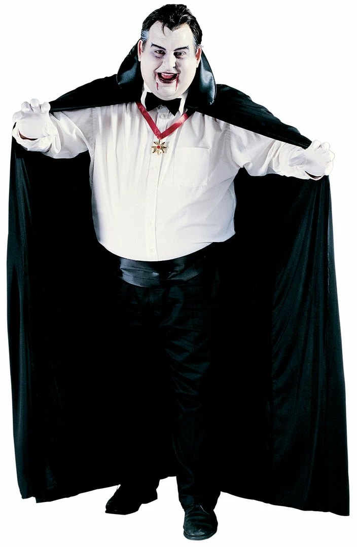 The big and tall cape is the longest cape we carry. It is made of a lightweight nylon with a tie neck closure and a padded foam collar covered in a satiny taffeta fabric. The cape includes a vampire medallion but you don’t have to use it for a vampire. This is a great seller for Darth Vader, Batman or for Masquerade. This cape is advertised as a plus size garment and will easily fit someone up to 300 pounds but we also sell it for average sizes too because of the length.
