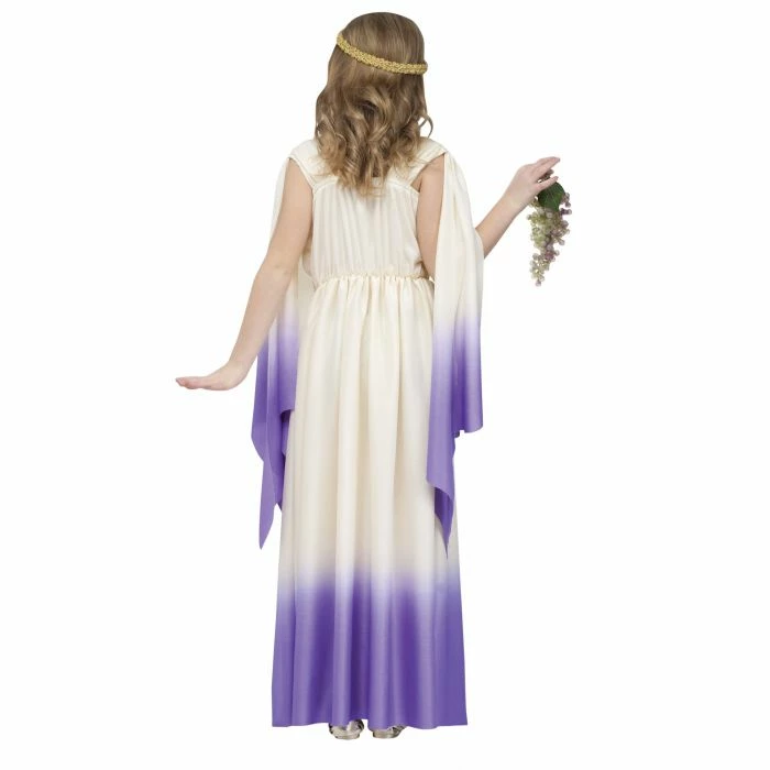 Lavender Goddess Costume for girls has a beautiful Greek Key ribbon trim design to give you the essence of ancient times. The dress features a lavender ombre at the bottom and rouched tank bodice.