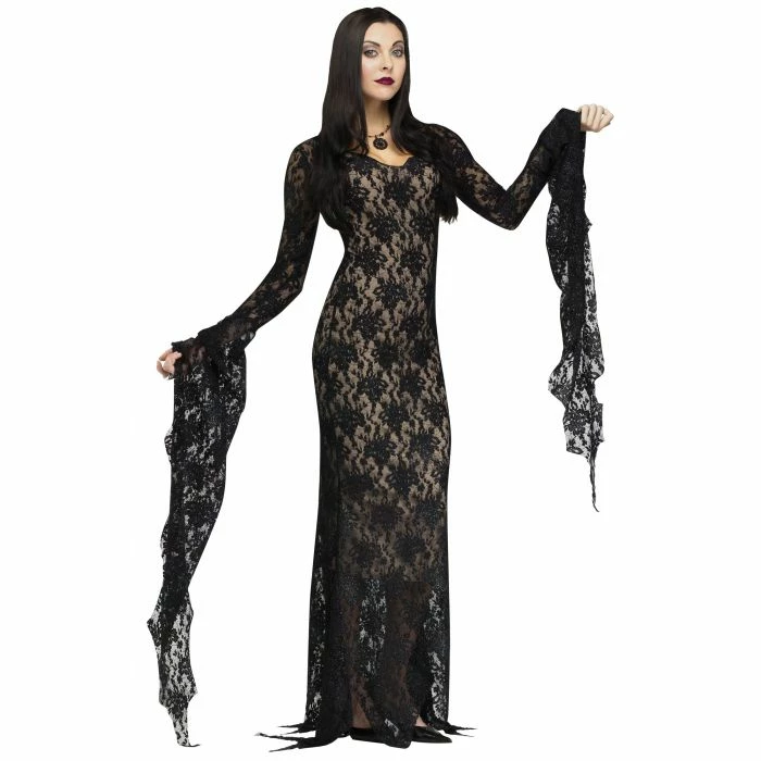 Gorgeous Miss Darkness costume flatters any figure! The tan tank liner under the black lace stretch gives you an hourglass look. The extra long draping sleeves and dress length adds to the elegance and mystique of this character. Also available in Plus Size.