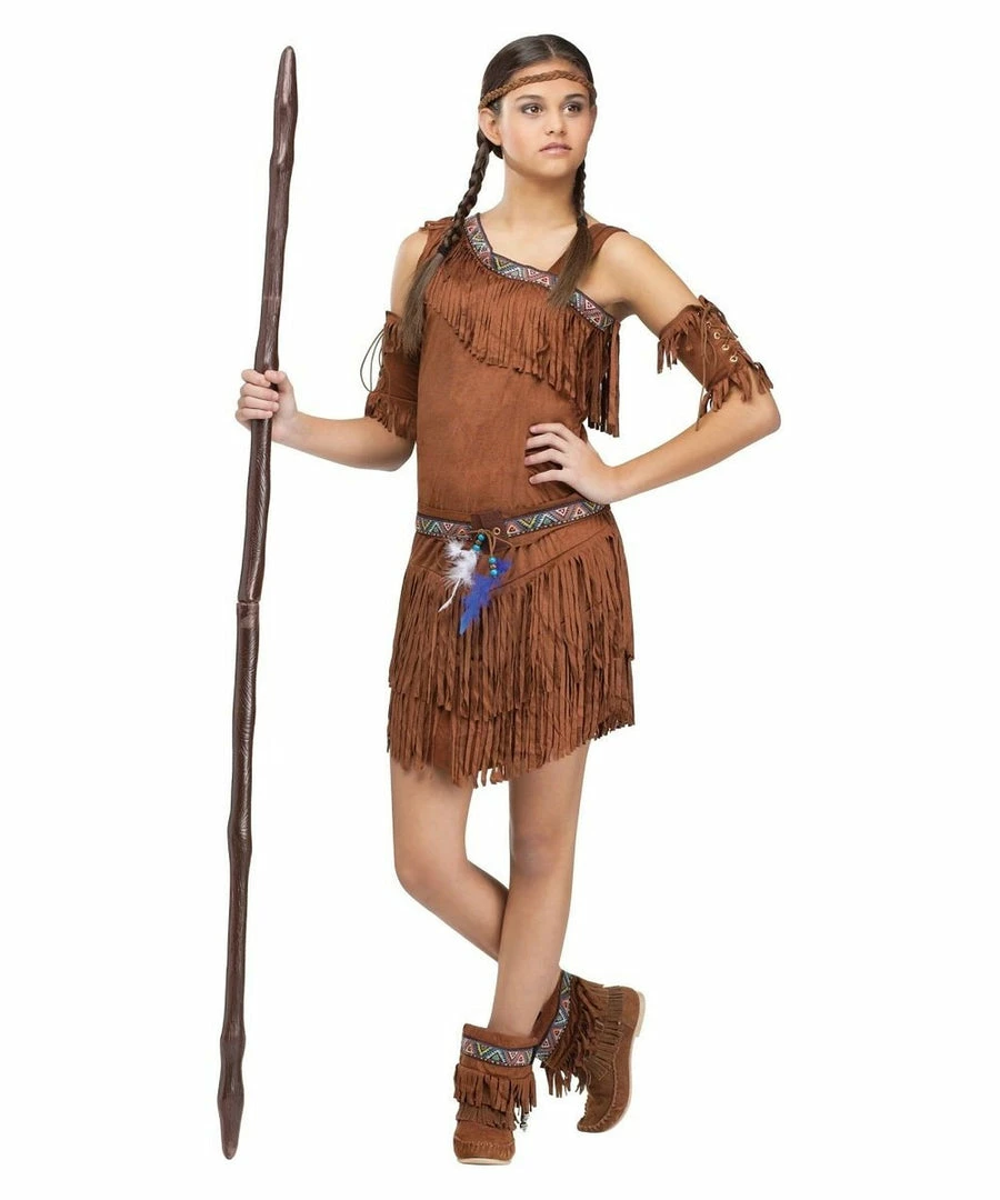 Native American Pow Wow Teen Costume is made of faux suede stretch that runs generous so it will fit a small adult figure perfectly.