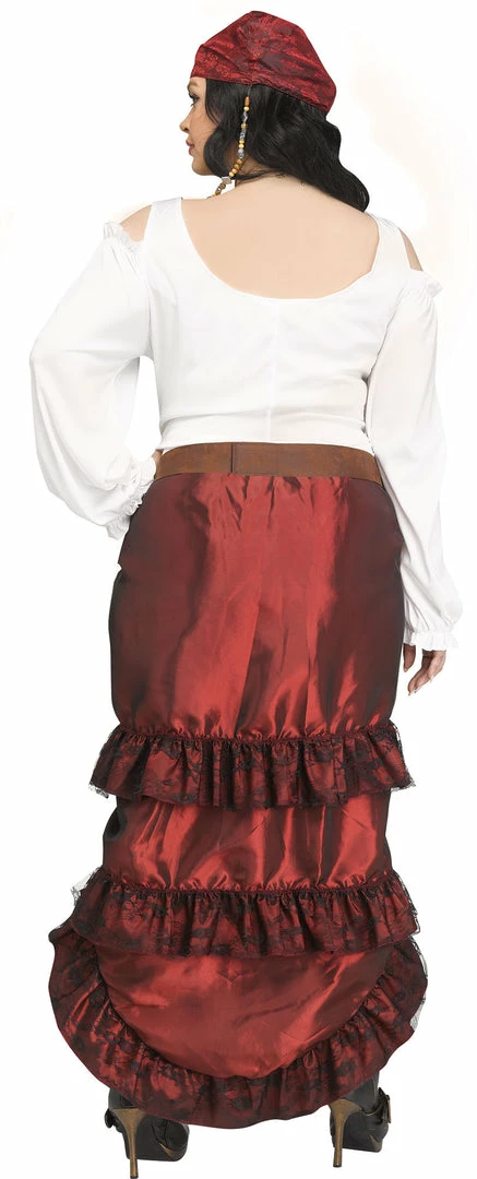 Make everyone else at the party walk the plank while you take your reign as Pirate Queen! This flattering costume is a dress with attached vest and contoured high lo skirt with ruffle edging. The belt and headscarf finish off this fabulous look. Complete your look with boots, fishnets, jewelry and a sword.