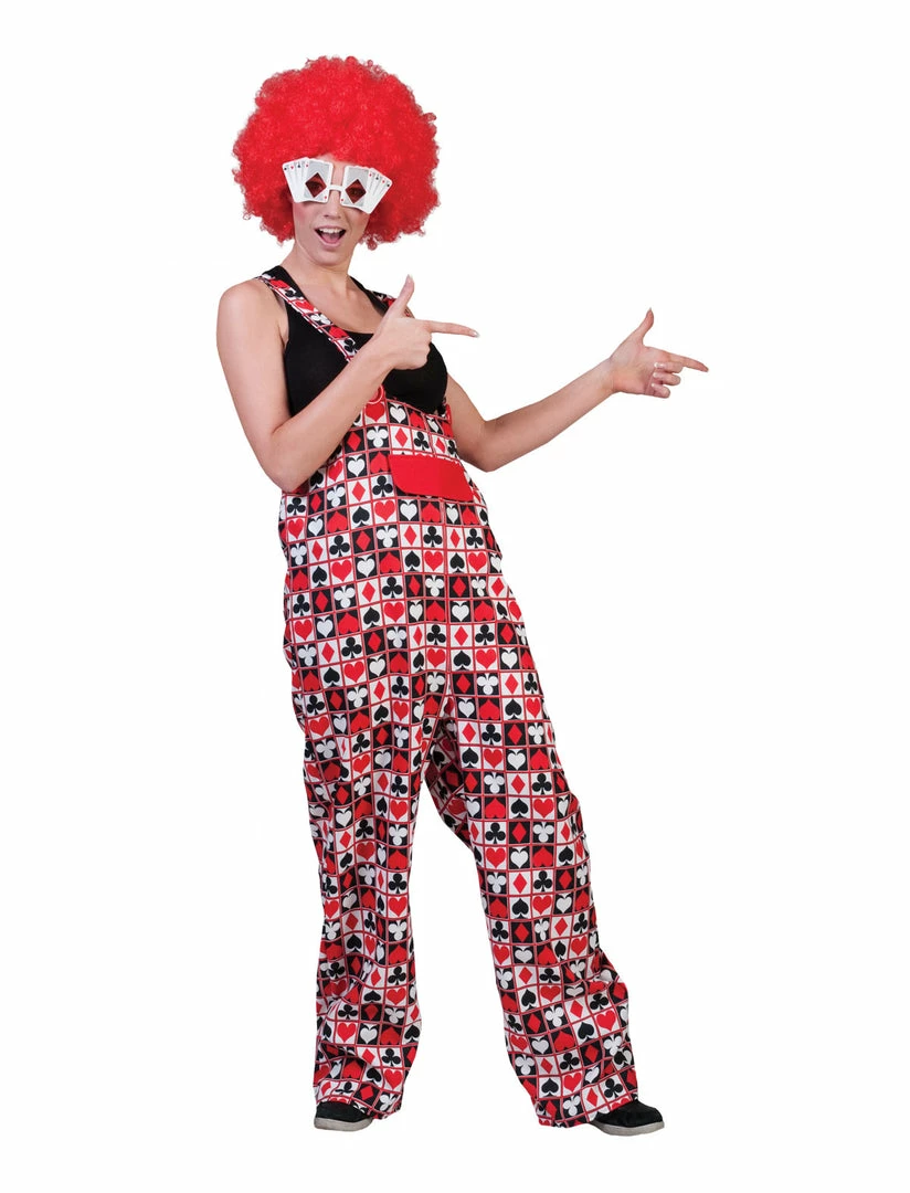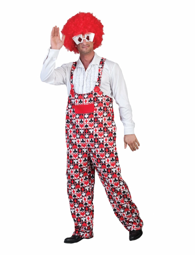 The loose fitting Clown Card Pants have have a red, black, and white card suit theme print. The attached suspender straps have the same print and there is a small red pocket on the front. Please be advised, these fit very generously. Includes pants only, all other accessories are available separately.