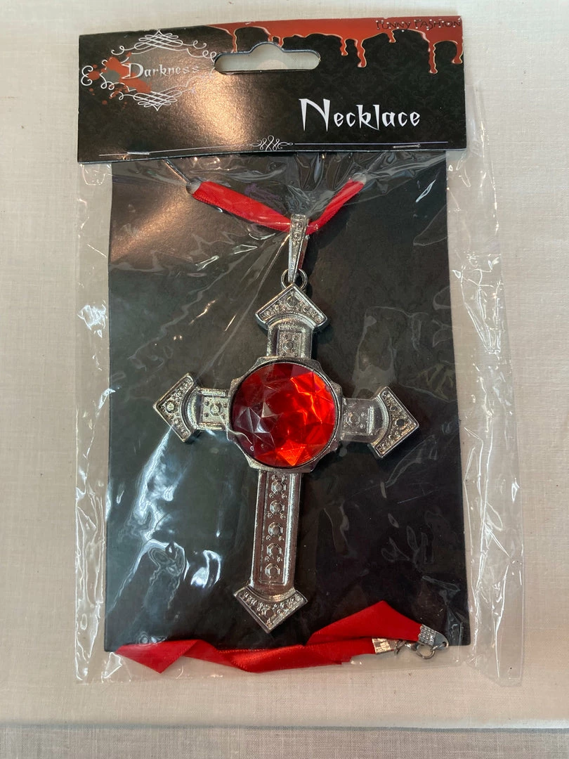 The large gothic cross has an ornamental silver base with a large circular red stone in the middle. The pendant is 5.25″ tall x 3.5″ wide and there is a red ribbon attachment around the neck with a clasp.