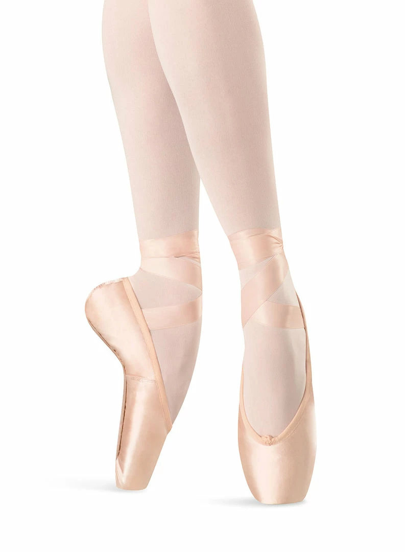 The Bloch Hannah strong is the stronger shank option of the Hannah that you already know and love. This pointe shoe is suited for the dancer looking to strengthen and build her foot. Generous platform that encourages balanced weight distribution that can reduce pressure on individual metatarsals. Curved last that closely mimics the natural contours of the foot so the shank stays in close contact with the instep.