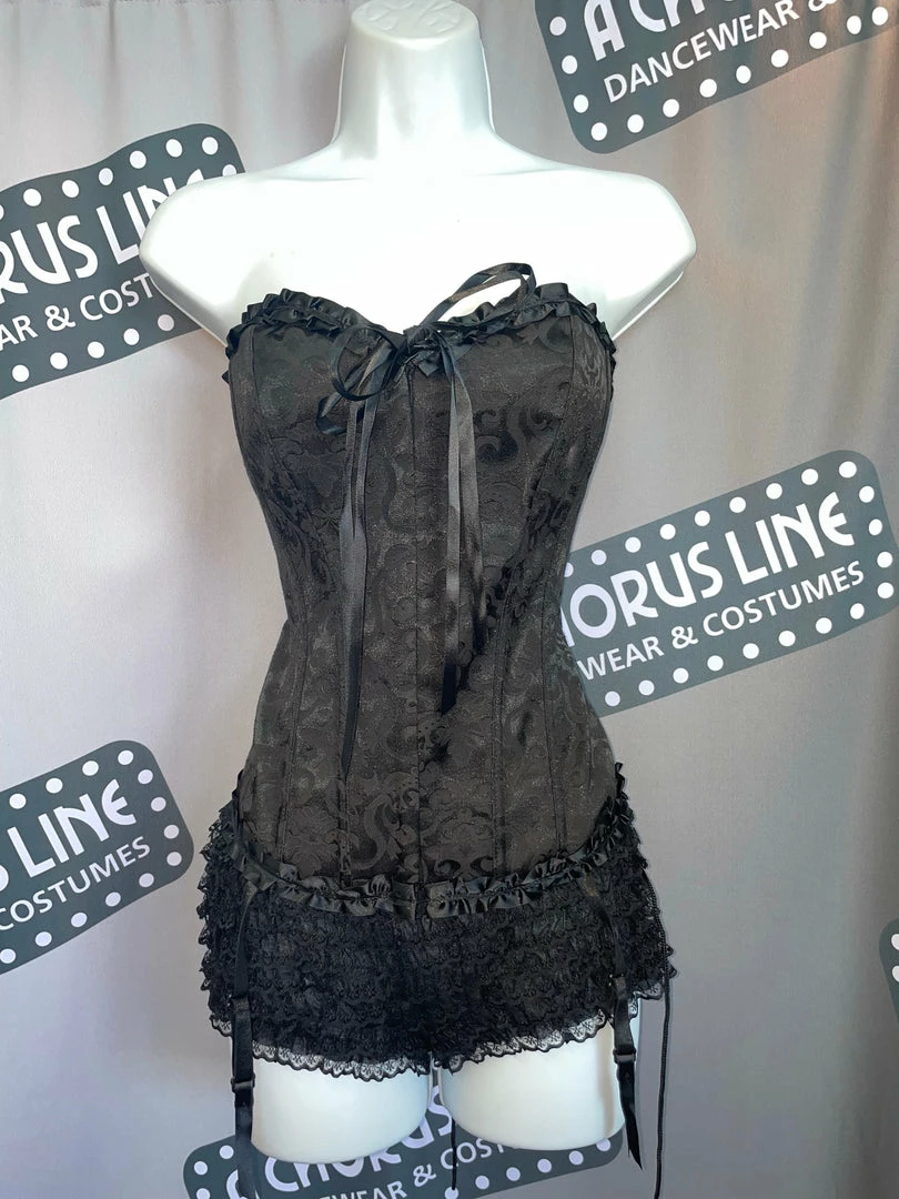 The Hilton Corset is a sophisticated black corset. The black or red base with tonal brocade, ruffled edging and a satin ribbon tie gives this corset an elegant look. There is a hook and eye front closure and a lace up back with body shaping boning. Perfect DIY starter for Can Can, Pirates, Vampires and so much more. Please be advised that these are costume corsets with light compression.