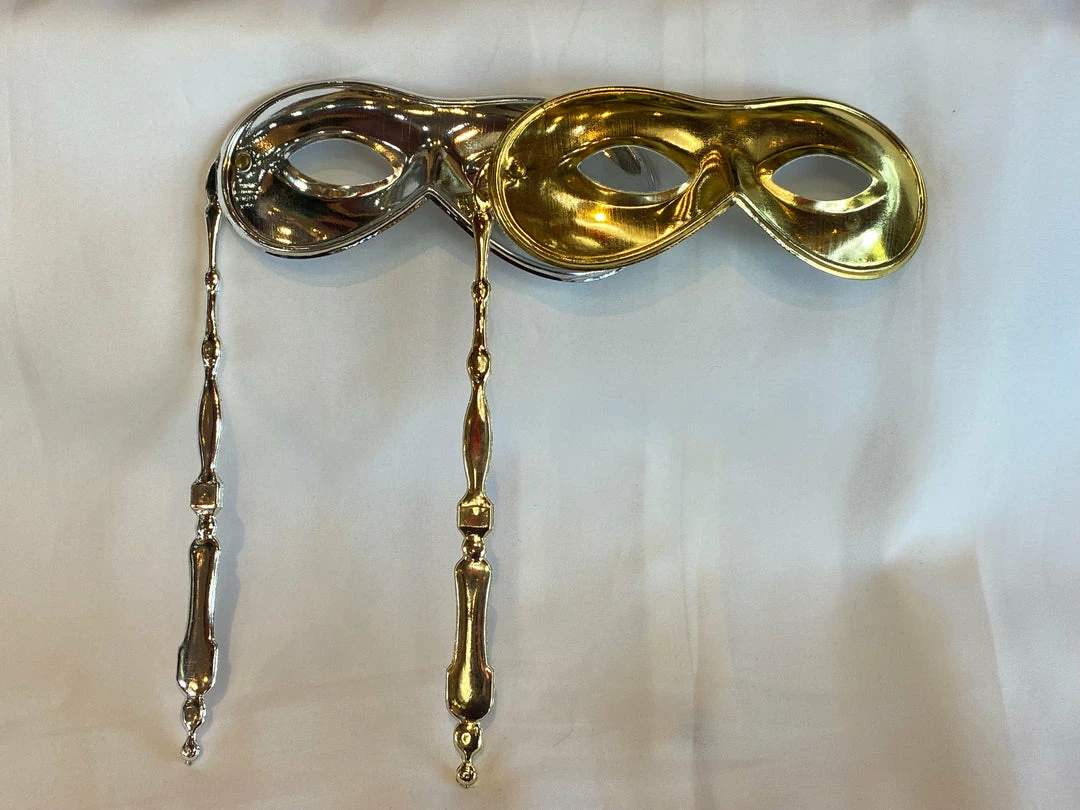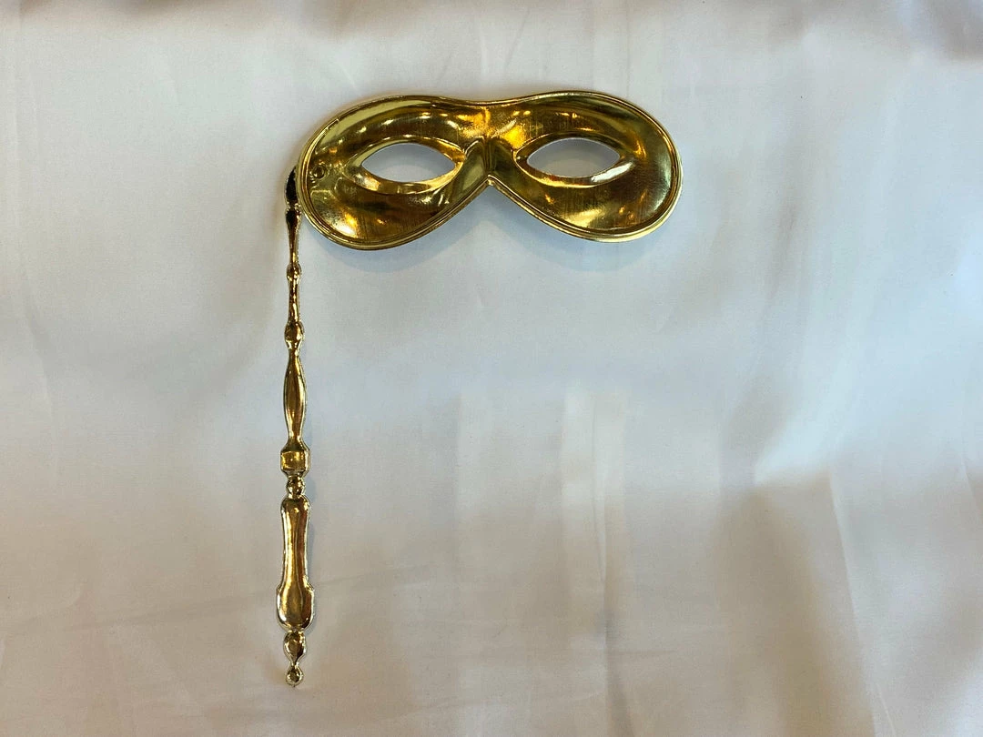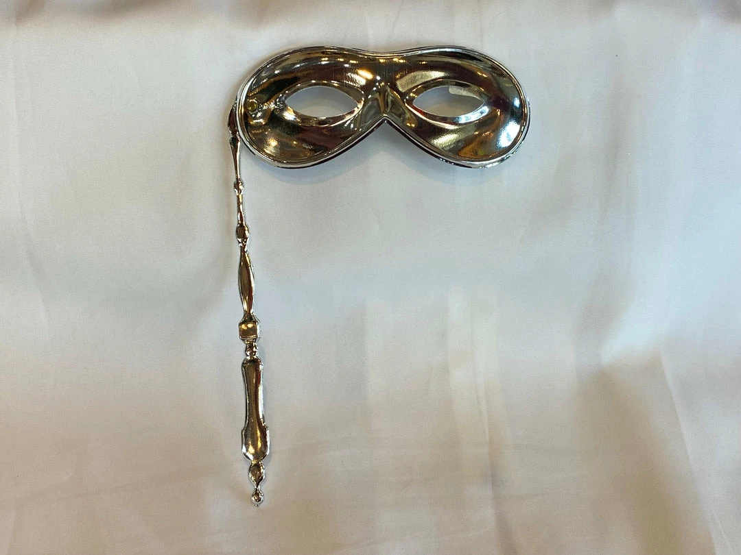 The small and simple domino mask in gold or silver has firm backing with a stick for a perfect masquerade look. The attached stick has a tight jointed top so the mask can move down or stay upright. Keep it as is or embellish it for a unique look.