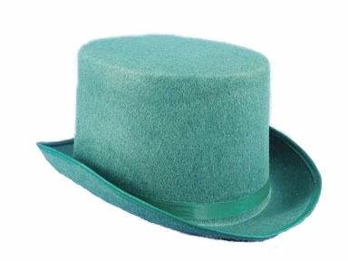This kelly green felt top hat has a narrow brim and silk band. Great for St. Patrick’s Day, magicians or ringmaster costumes!