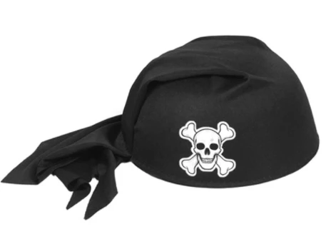 The pirate cap is an easy to wear structured cap with a dangling sash to appear like a headwrap with a screen printed Jolly Roger on the front. One size fits adults but hat foam could be added to make it smaller for children.